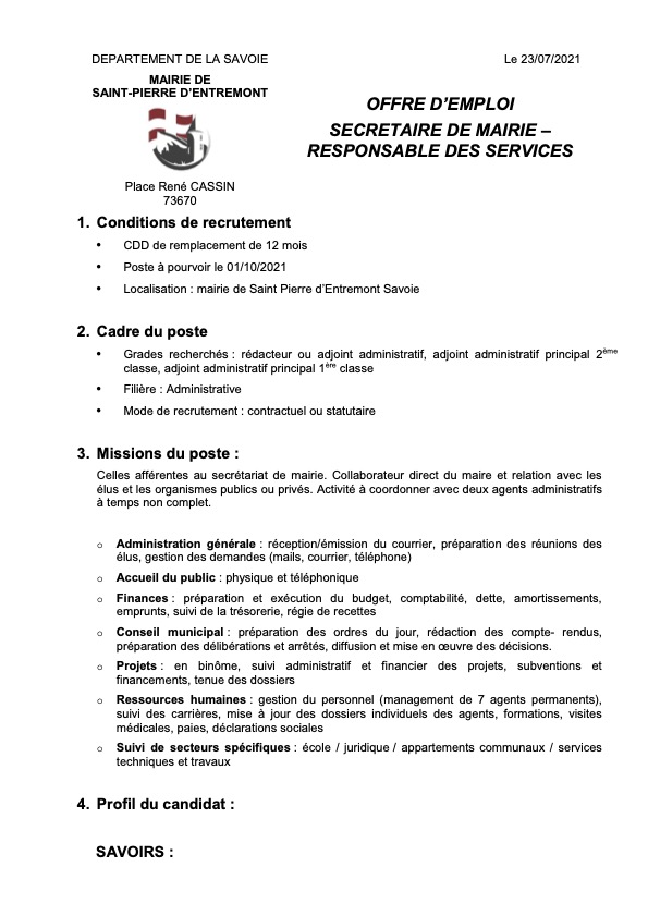 2021-07 Offre d’emploi-Secretaire de mairie remplacement 24 JuilPleine résolution (595 × 841) ← Précédent Suivant →