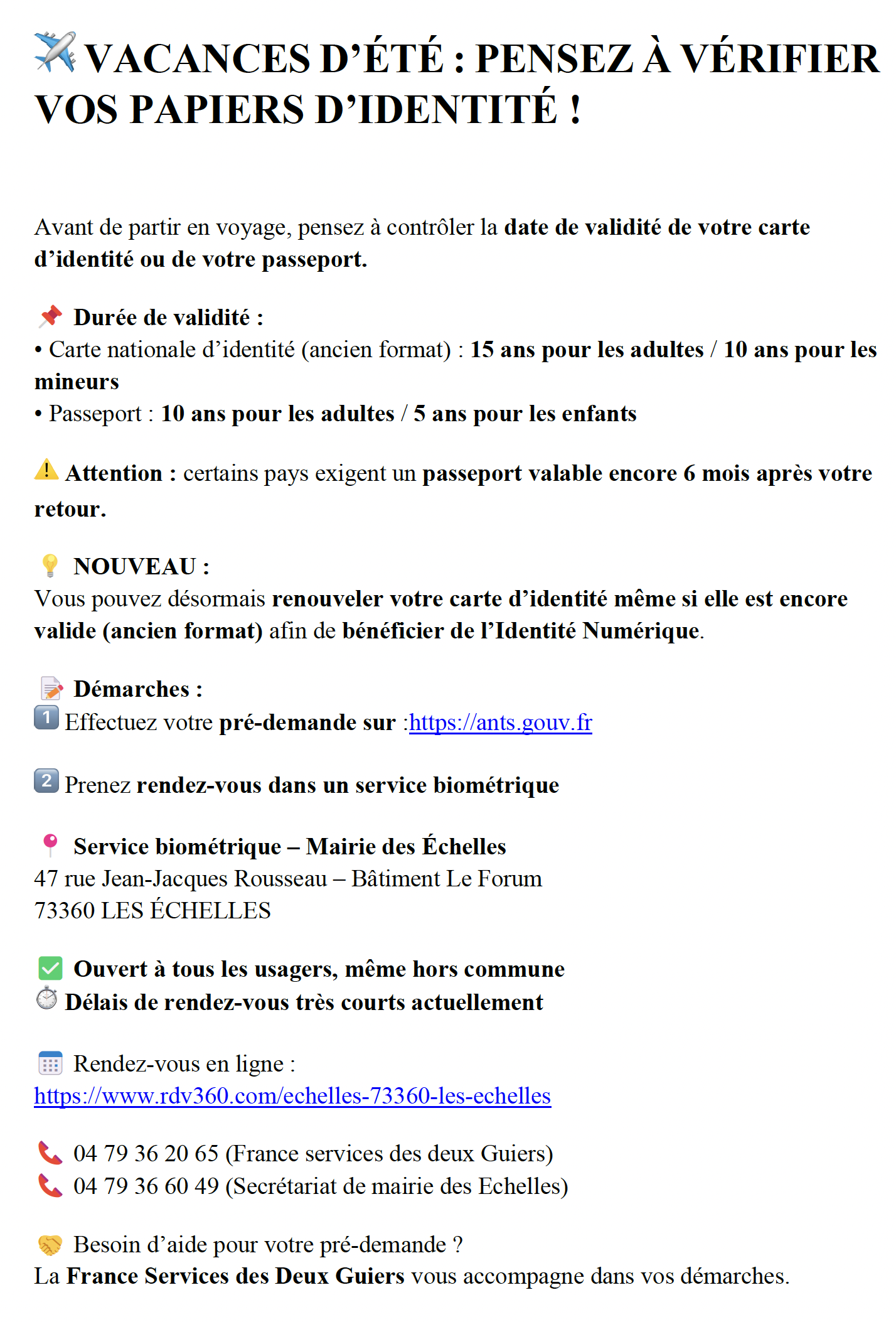 Le service biométrique de la mairie des Échelles (47 rue Jean-Jacques Rousseau, Les Échelles) est ouvert à tous les usagers. Les délais de rendez-vous sont actuellement courts : profitez-en.