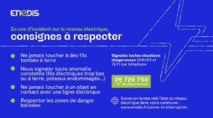 - signaler à Enedis tout incident ou anomalie constatée via le numéro 09 726 750 + XX (les deux chiffres du département concerné). 24h/24 et 7J/7,