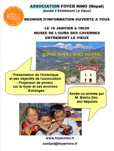 L’association Foyer Nino organise une réunion publique d’information sur son objet : accompagnement du fonctionnement du foyer pour enfants dans le Pays Sherpa au Népal le 16 janvier 2026 à 19h30 au musée de l’ours des cavernes à Entremont le Vieux.