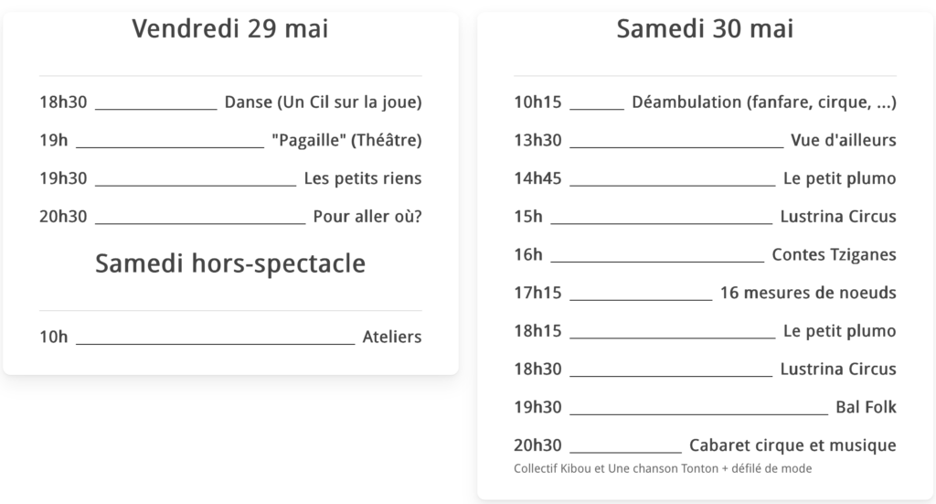 Mêlant pratiques amateurs et professionnelles, le festival propose un programme riche sous chapiteau, avec danse, théâtre, cirque, musique live et bal folk.
